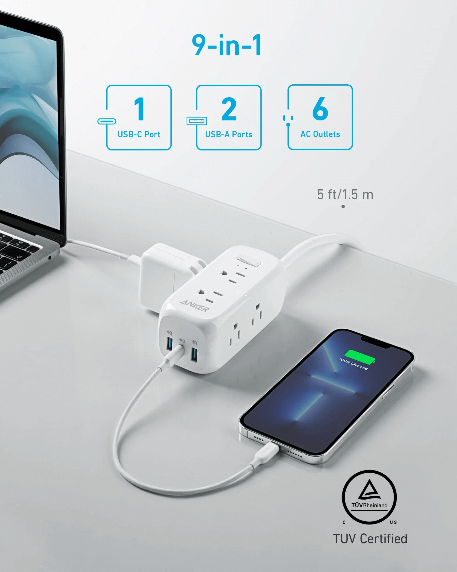 Ổ Cắm Điện Kiêm Sạc Anker 322 – 6 ổ cắm – 3 Cổng Sạc Nhanh 20W – 9 Trong 1